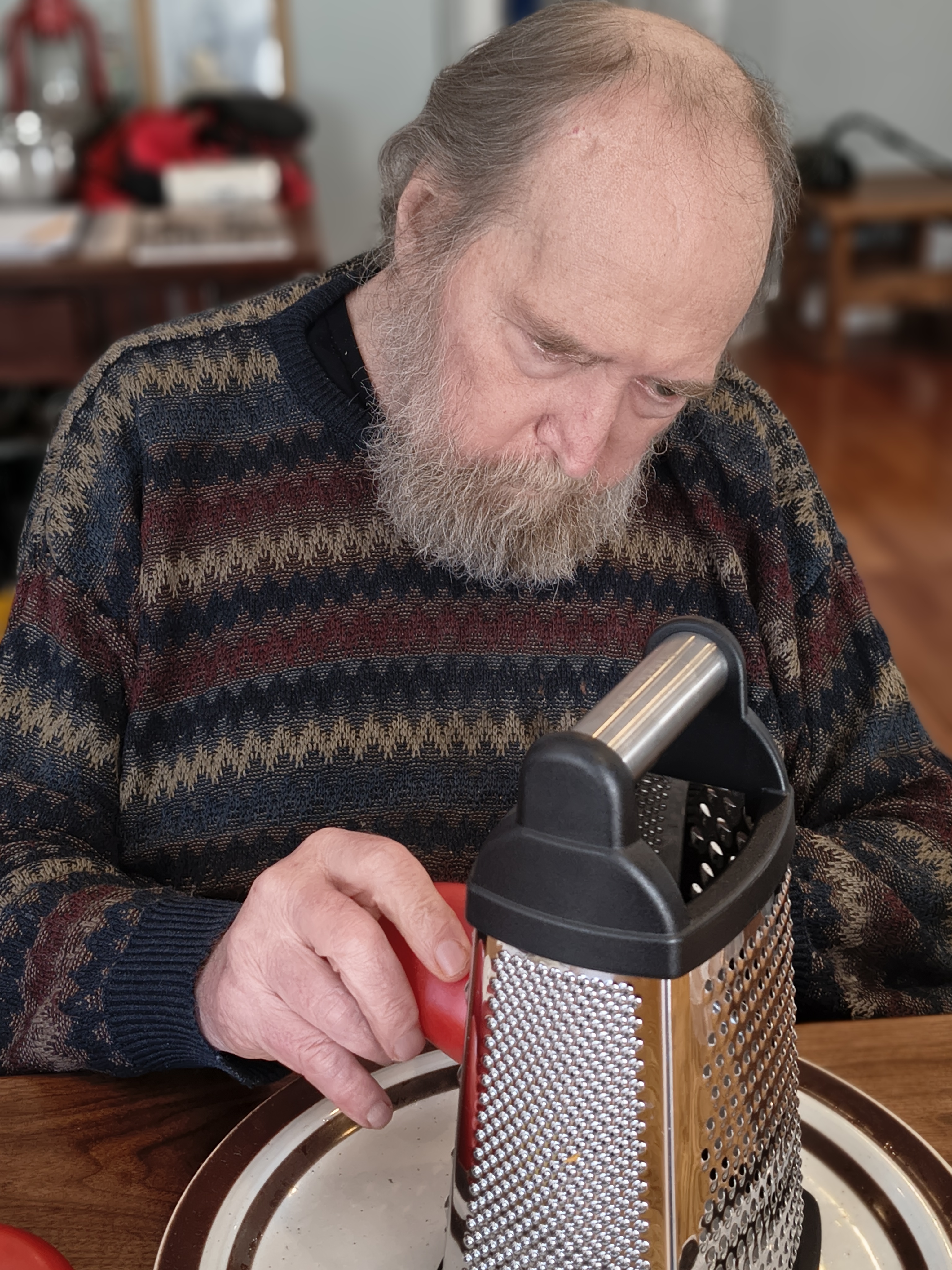 What I continually learn on this journey with Steve as a cancer and stroke survivor is the power of meaningful and functional engagement with the world. Do a physical exercise just to do the exercise, no matter how good it is for you? Nope. Need to help do tasks to feed family and friends as you’ve done all your life? Oh heck yeah! Someone was fiercely determined to grate the roma tomatoes for a big batch of no-cook pasta sauce. He gave it a good effort but those tomatoes were tough so out came the knife. Big chunks to toss in the blender along with garlic and celery. Success with the slicing … except, as I turned around, I noticed someone eating the tomatoes and so his sous chef position was temporarily revoked.