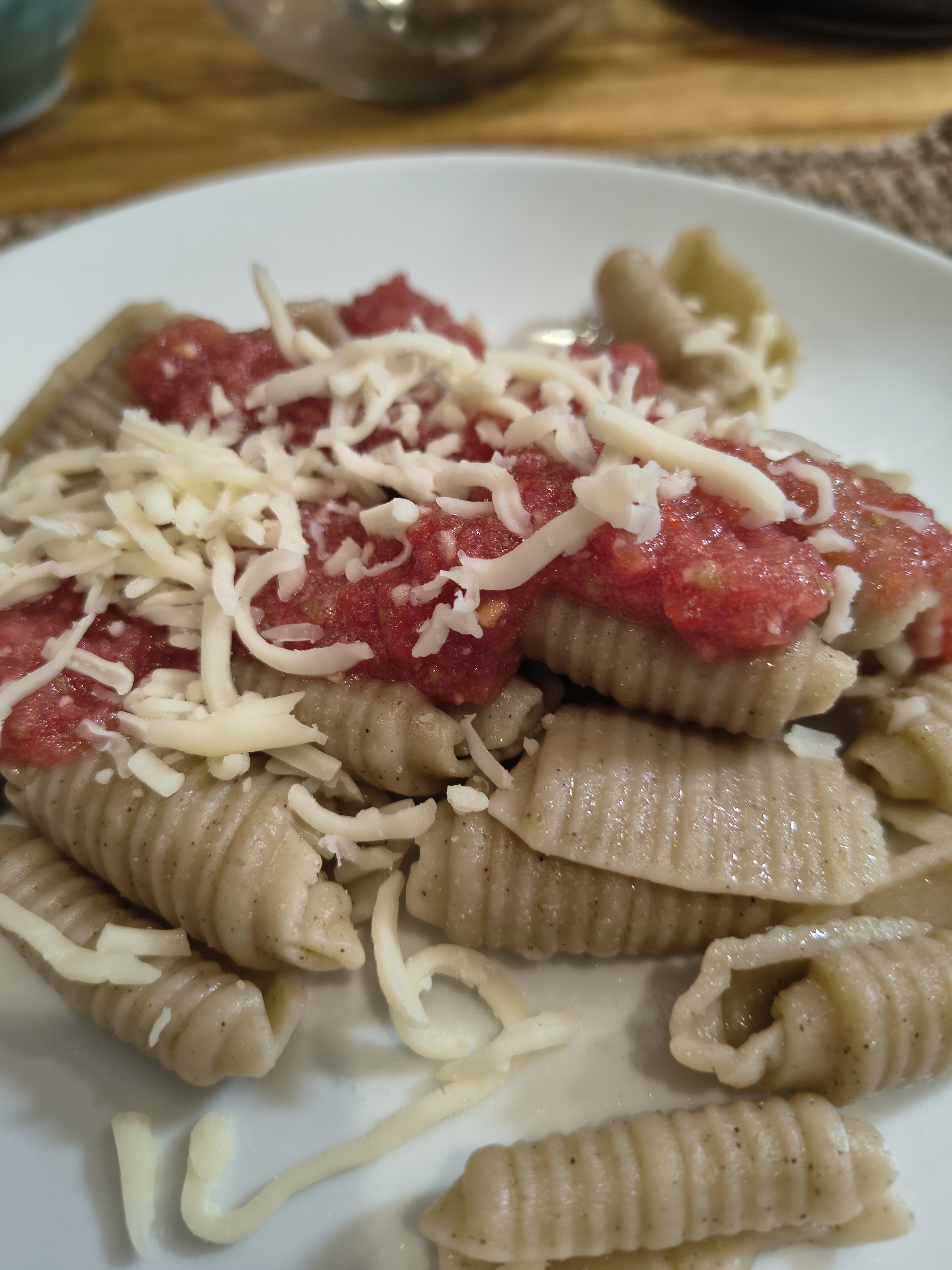 Later we did the taste test. I wanted to add salt (I always do) but Steve said, “It’s good as it is.” And so that’s how we served it up for dinner with some items on the side, sliced leftover chicken, sauteed mushrooms and mozzarella cheese.
