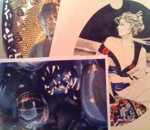 Each geisha kimono is partially composed of nature photography — the images printed on acid free paper and then applied as dictated by Zoe’s overall design. Once completed, her two geisha will represent the span and overlap of all four seasons.