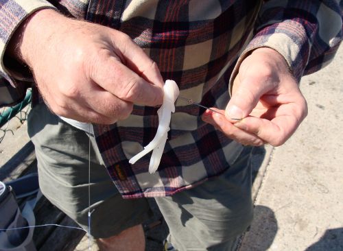 We used squid as the tasty lure. Once the hook had been baited, Steve taught me how to cast (last time the fellow did it for me). As I stood at the rail holding the rod, I was aware of the looks we received from the neighboring fishermen. As you can see I am still not quite up to speed on fishing attire. A few people came over to chitchat. I let Steve do all the talking. I stared out into the sea.