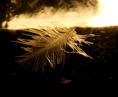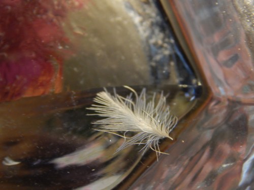I was racing around and suddenly grew thirsty. I picked up a glass by the bed and just happened to look down before I swallowed the little feather that had slipped out of its pillow to drift into my glass. And so, did I then empty the glass and relieve my thirst? Nope. I raced around to different light sources to see how best to illuminate this unexpected treat.