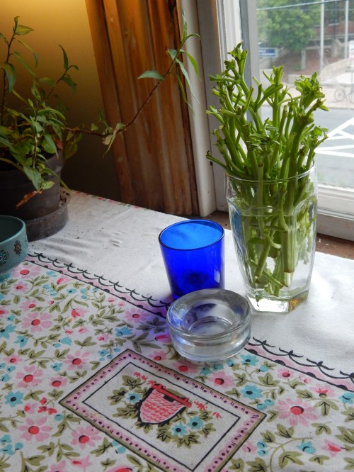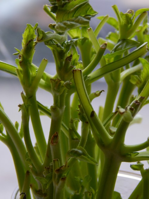 It may not look like much but I am rather happy with this pot of basil. It began as a handful of stalks after Steve and his cooking crew had picked a bag of basil clean in preparation for his pesto. There was just something about the branches that called to me that day. I thought the mass would make a great picture and I wanted to keep them upright so I placed them in a glass. And then, of course, I could not help but wonder what would happen if I actually placed water in the glass. I took some photos and then tucked the glass away. Then lo and behold, I peered into the glass one day and what did I see but roots! I let the roots grow and even added a tiny bit of fertilizer and then soil to the water. The roots grew long and strong and new leaves unfurled. Until finally I could plant this … everlasting plant … in a new pot of soil. It’s the little things … π