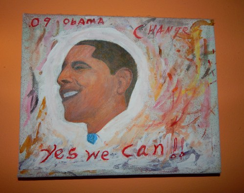 And then there was Obama. Born in the south in the 1930s, having experienced the realities of racism firsthand, Obama’s election meant a great deal. “I have a better painting of him,” he said as I gazed at this one on the wall, but we never got around to finding it.