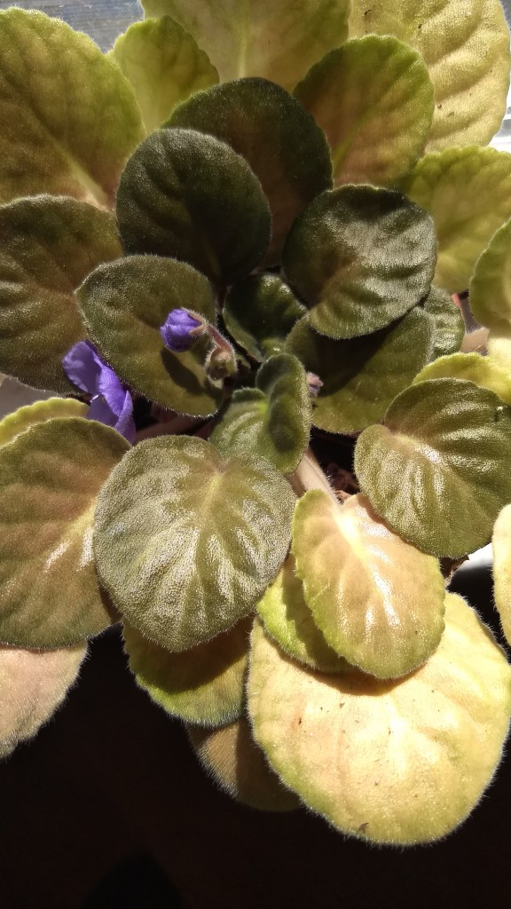 I have a tendency to overwater African violets. But when I tuck them in a sunny nook where I forget about them … voila! New green growth and several blooms in a lovely shade of purple.