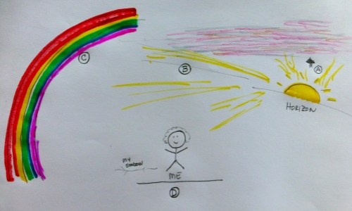 I’m no illustrator but I do enjoying pressing colored pens to paper, and the weather this weekend provided a good excuse. You see, after a heavy rainfall late Friday, the sun came back out. There was that magical moment of rose red clouds appearing. I stood at one window watching the clouds form, but then by chance, I glanced over my shoulder through another window. A double rainbow graced the sky. Later I tried to explain to that science guy of mine the beauty that I’d seen of rose clouds in front of me and being surprised by the rainbows behind me. His response? “Of course. Your shadow points toward the rainbow.” Hunh?!