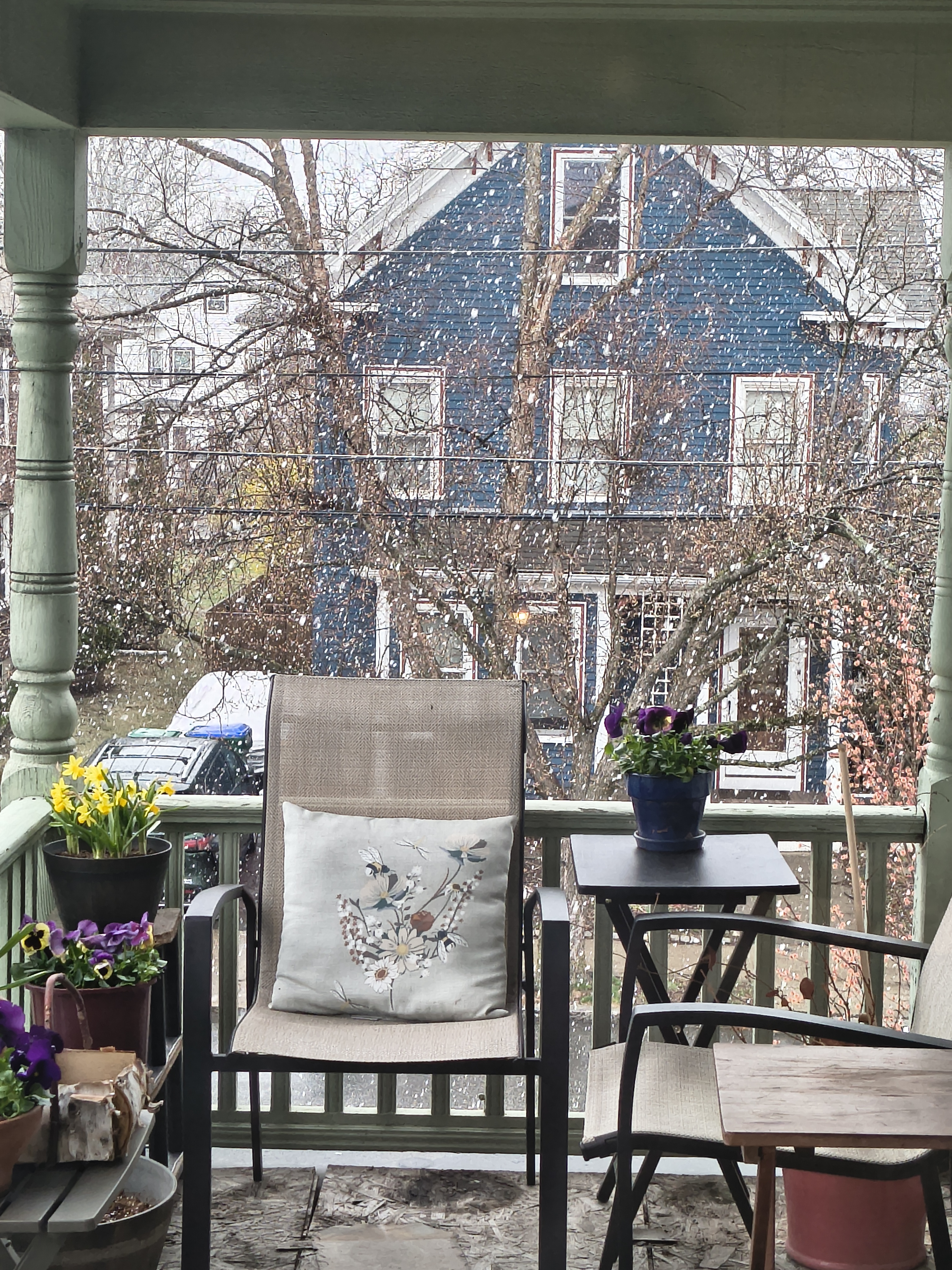 It was quite lovely when it first fell and then the big flakes turned to sleet and then rain and then the sun burst forth. All the seasons in one day.
