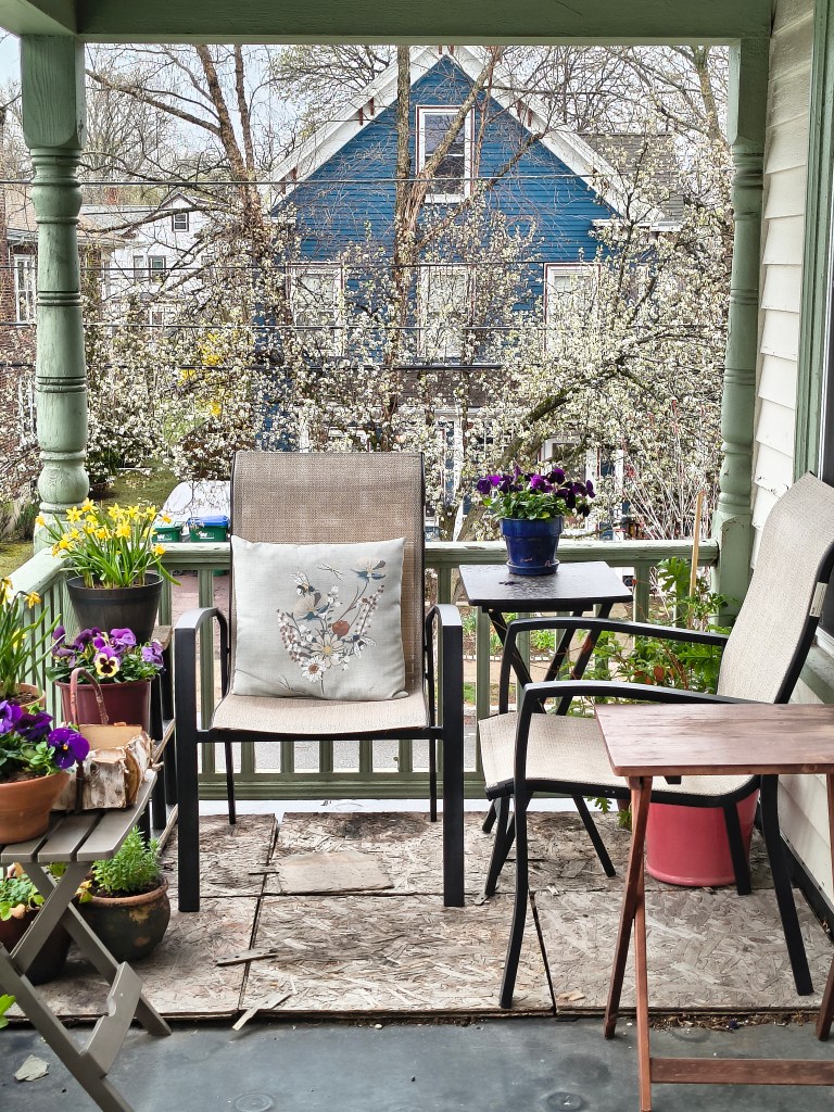 … but emerging white blossoms on the tree across the street. In the fall, this tree’s leaves turns bright red.