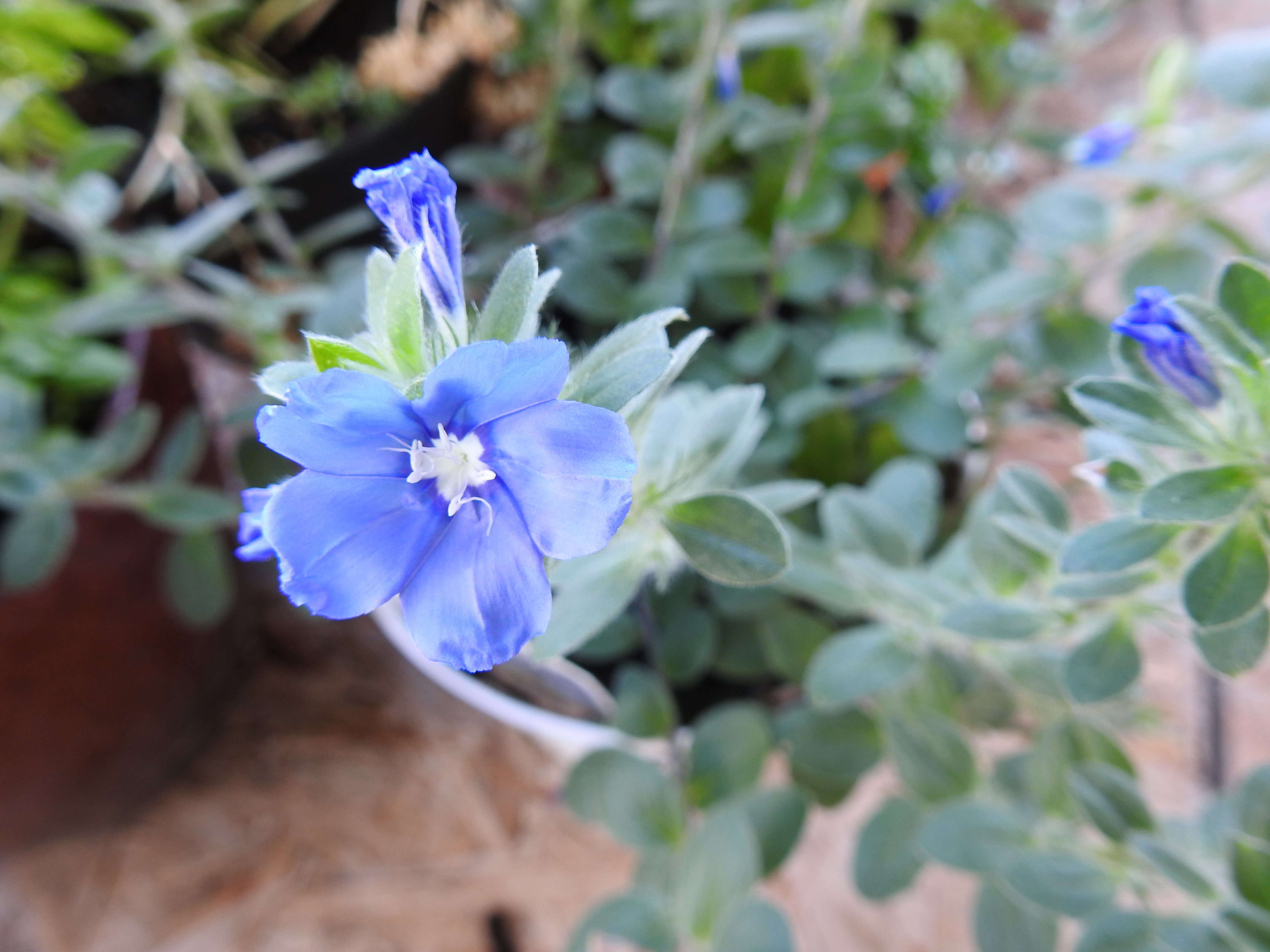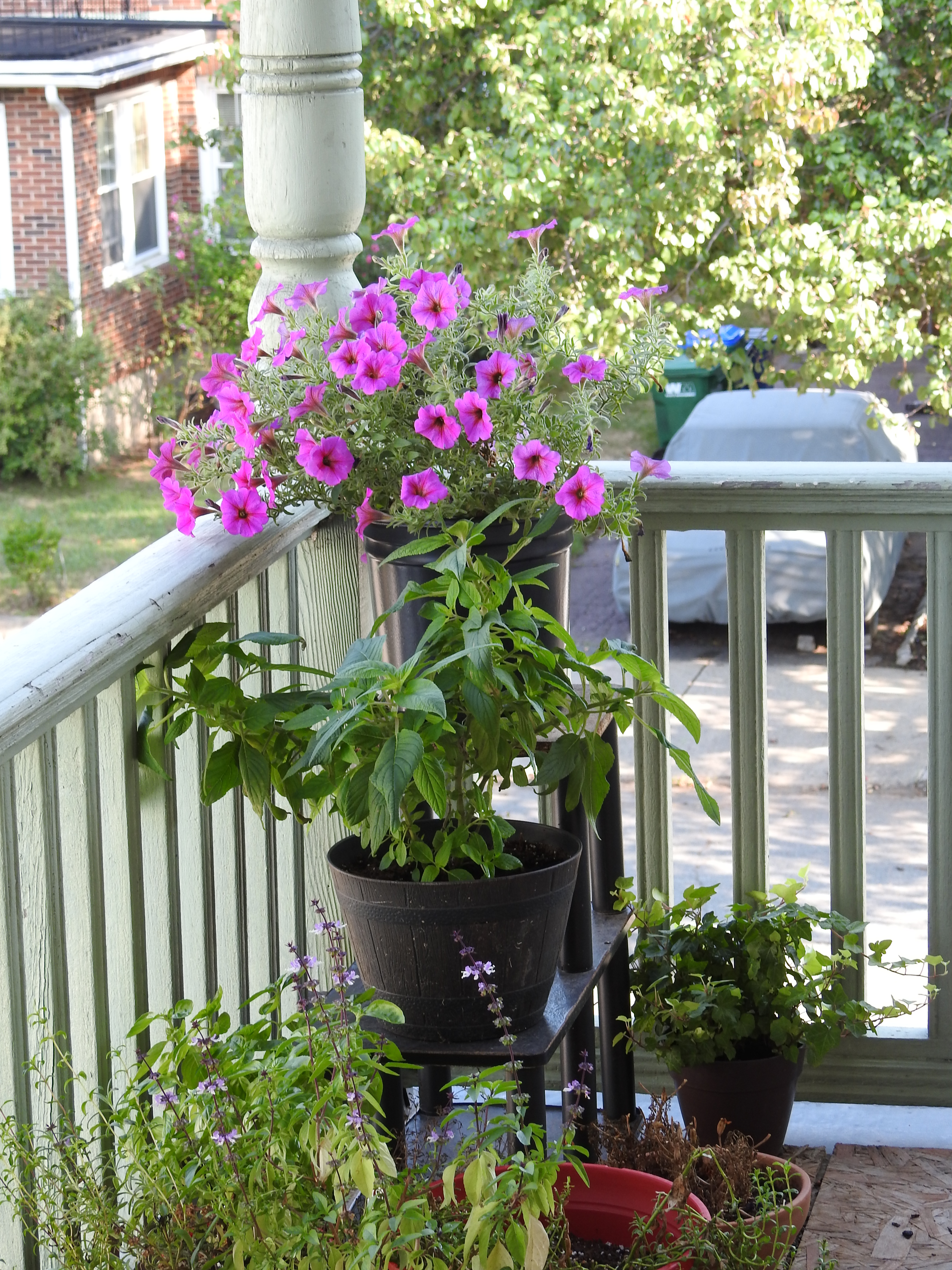 On the porch are two pots of sweet basil, two pots of Mexican tarragon, Thai basil, pineapple sage and to fill out the corners and spill over the bannisters, a large pot of magenta petunias and a small pot of ivy. And then there is the evolvolus hybrid or dwarf morning glory. A completely random purchase because the pickings were kind of slim at my Home Depot garden center but I needed to buy something even if it wasn’t edible.