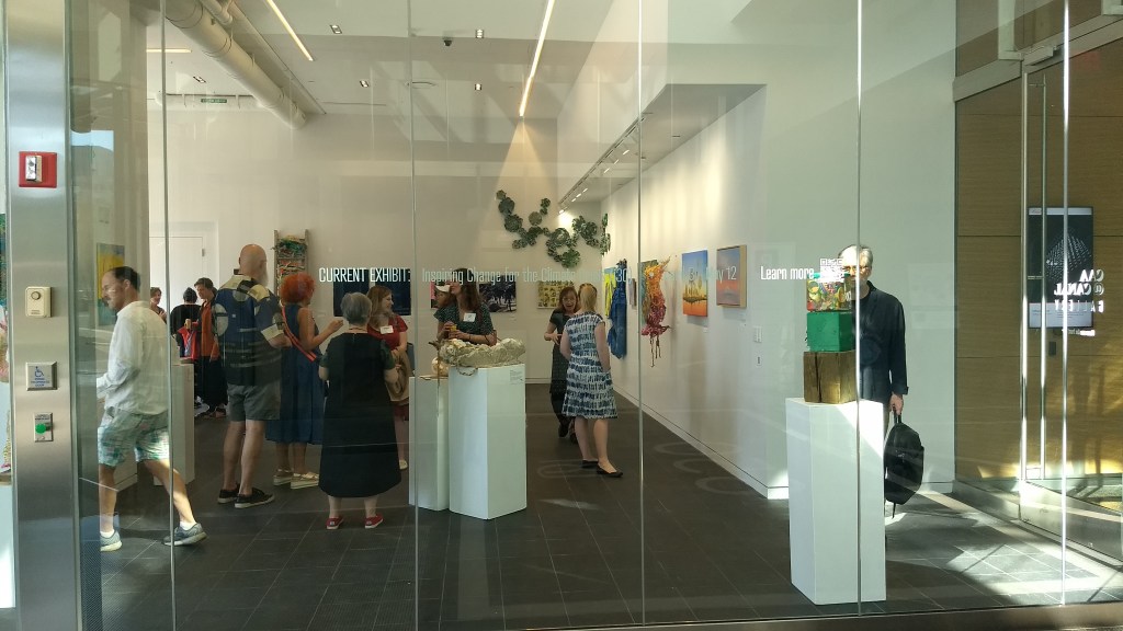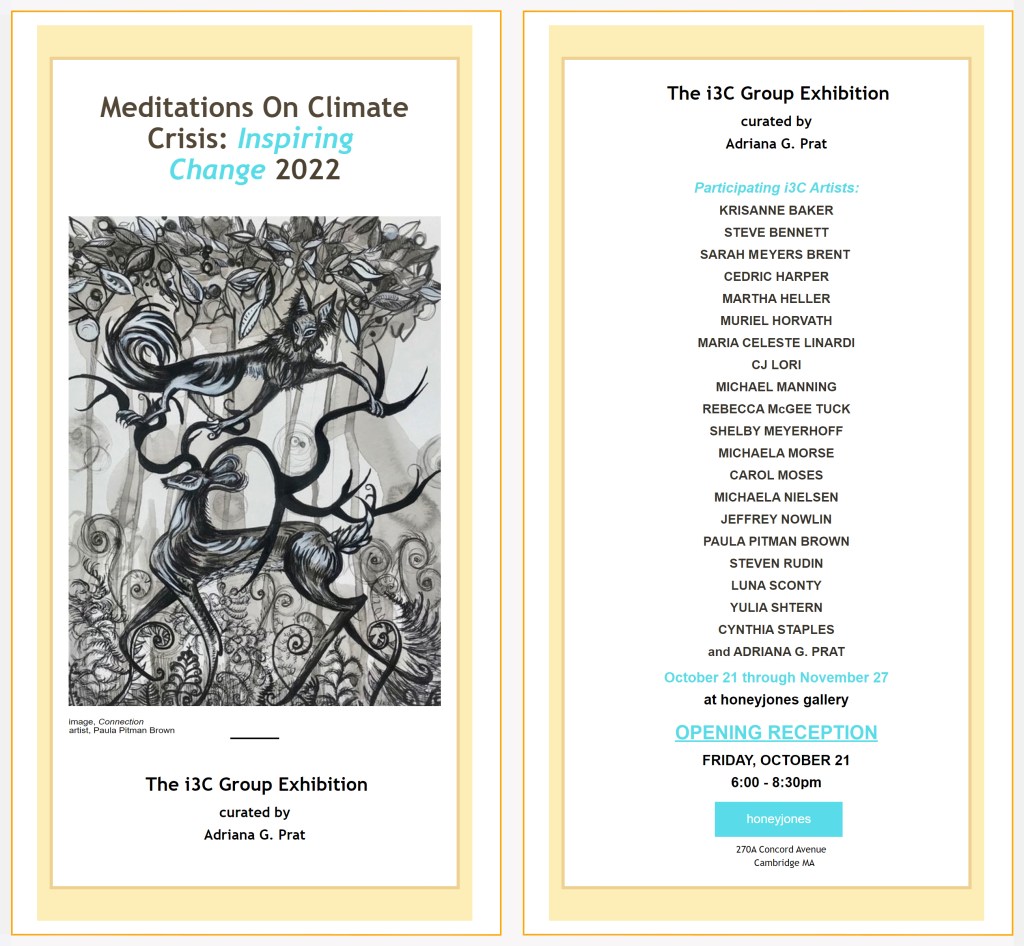 What a delight to attend the opening reception of the i3C exhibit at the gallery CAA@Canal. As stated in the press release of the Cambridge Art Association, “The Cambridge Art Association (CAA) is pleased to announce Inspiring Change for the Climate Crisis (i3C) at CAA @ Canal, a Members Curatorial Exhibit, curated by artist and scientist Adriana G. Prat and including artists from the i3C (inspiring Change for the Climate Crisis) group.”