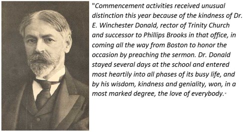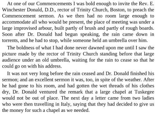Later in his autobiography, Washington gives his personal recollection of the 1895 Tuskegee commencement in which Dr. Donald spoke: