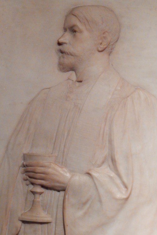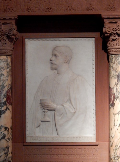 I’d seen the sculpture many times inside Trinity Church but not truly appreciated it. A man holding a cup, a cup-bearer, but the person depicted had no context for me.  I knew nothing of his significance in the past or in the present.  There were too many other visuals capturing my attention, like sunlight through stained glass windows.  Only recently have I returned with greater respect to the relief of Elijah Winchester Donald, Rector of Trinity from 1892 until 1904.