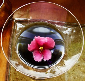 The sun came out as I was setting up the shot, and suddenly reflected in the surface of the liqueur were the leaves of herbs and other plants nearby, including an African Violet. I plucked a blossom and photographed violet upon violet.