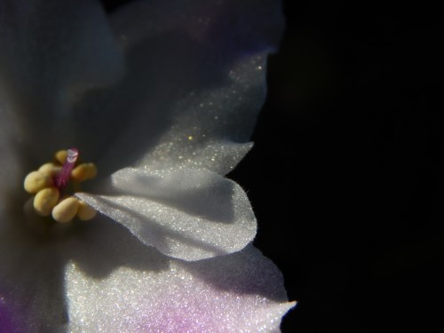 I have been photographing this African Violet since at least 2010. This past year, the plant grew spectacularly well. Mostly because I tucked it into a corner and let it be. Now at the start of this first full week of 2014, I photograph the plant again. It is an overcast day which is all the inspiration needed to pull out flashlights and let the artificial light play upon iridescent petals and leaves.