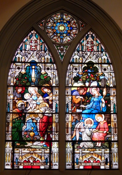The windows are housed in a structure that has evolved quite a bit over its history from its original construction in 1861. As the parish grew, adjacent plots of land were purchased and new adjoining structures were built including a parish house, west transept, and two chapels. The Lindsey Chapel was the last to be built between 1920-1924. A poignant tale is at the heart of its construction but I shall save that story and those images for another post.