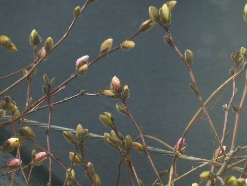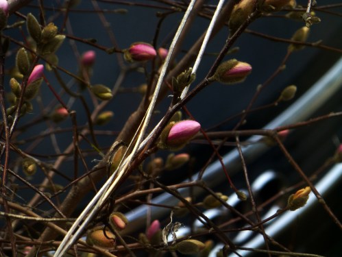 I took these photos a few days ago, indeed, after a spring rain. Today, these buds are bold blossoms, their petals glistening quite beautifully in melting spring snow. I didn’t quite have the heart to photograph the snow. 😉