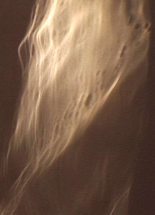 So what I captured on the wall one morning took place in less than four minutes and thirty-three seconds. It involved a rippled window, a different one in the house. Light shone down through the gaps in the leaves and branches of the oak tree that towers over the house. That light made its way through the glass refracting through the ripples producing a dynamic pattern of caustics on the wall. Most often that pattern of light is static but this particular morning the wind was blowing. The branches and the leaves they moved creating what that physicist described as “a pattern of illumination that varied in space and time.” It was a good moment inspiring some experimentation as you can see in the video below. The flickering on the wall is as it happened … in less than four minutes and thirty-three seconds.