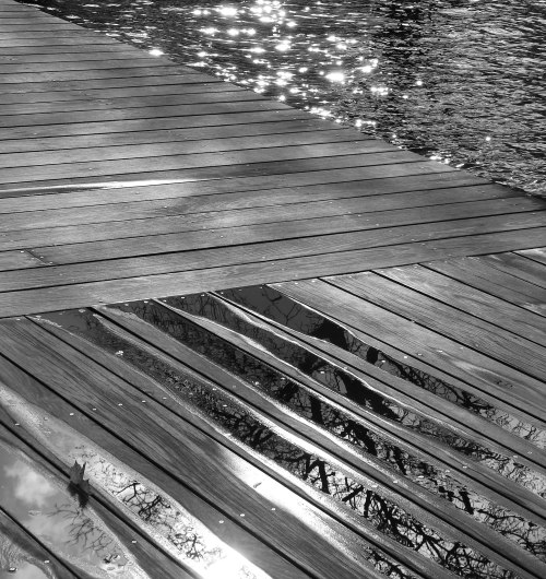Water is the common theme, with all its simplicity of form and complex properties. Unseen trees reflected in the still waters of recent rains along the Charles River Esplanade.