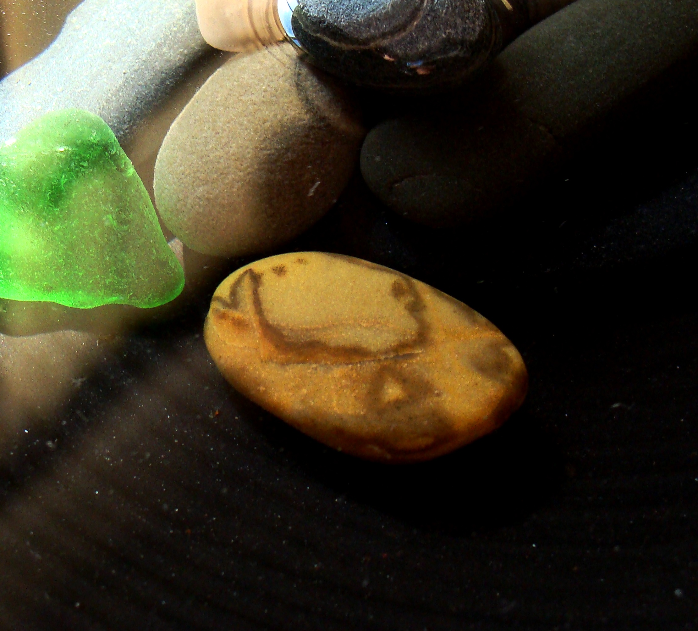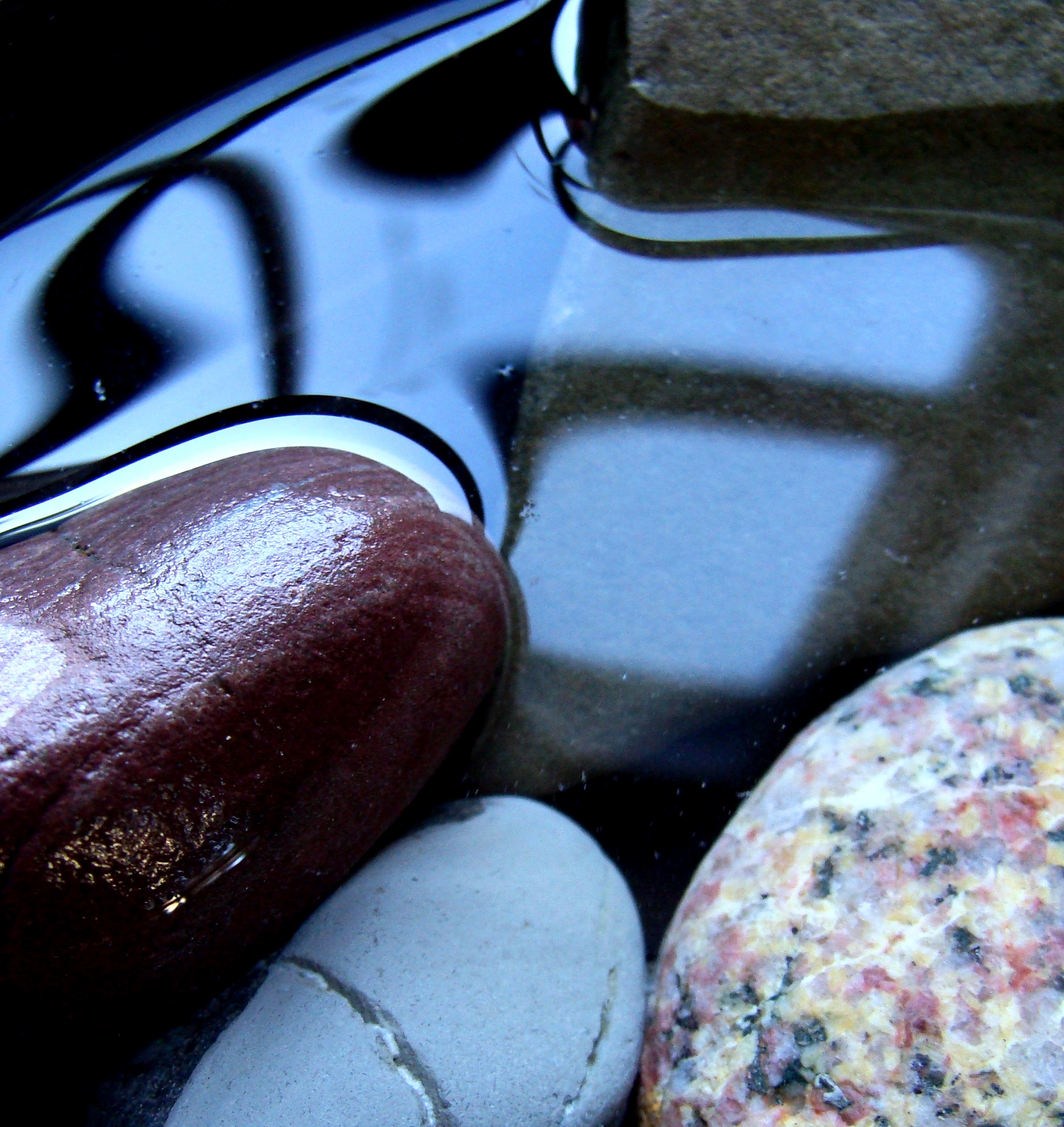 The following images are of rocks and shells and bits of colored glass found on different New England beaches this summer. I photographed them yesterday after placing them in a bowl I had rediscovered, a beautiful dark clay vessel lined with ridges. Eventually I filled the bowl with water. I snapped photos throughout the day whenever whimsy struck. Near dusk I decided I should empty the bowl before mosquitoes began to breed. Just as I drained the last drop, the bowl cracked in my hands. An unseen flaw had been exacerbated by the weight of water. In an instant, I was reminded of the beauty found in fragile things.