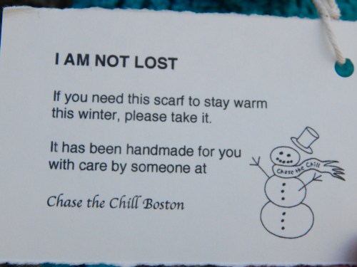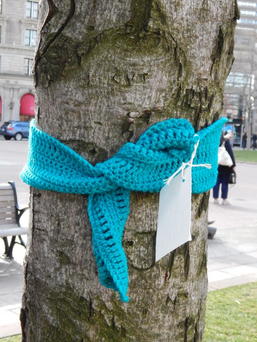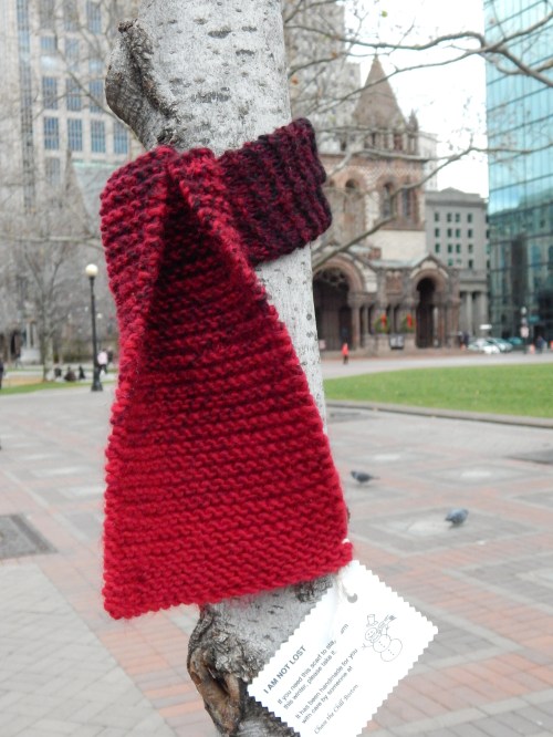 Increasingly, as one watches or reads the news, it becomes clear that individual as well as collective action will be necessary to help people survive this looming long winter. These scarves were tied around the trees in Copley Square today. You can read more about the people behind this particular grassroots program to help people stay warm here: http://www.chasethechill.com/