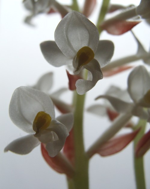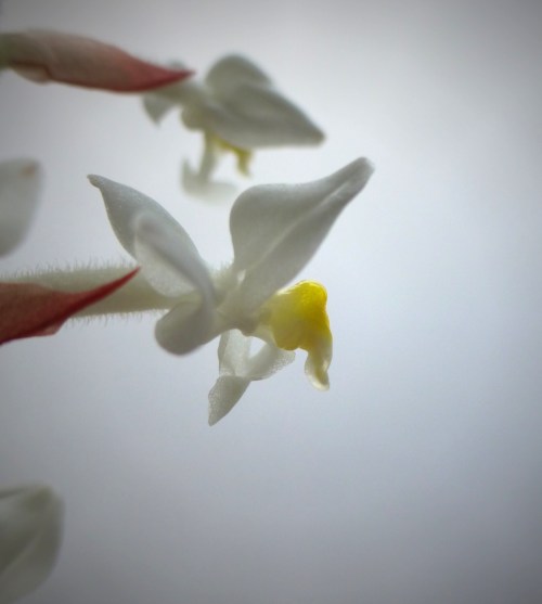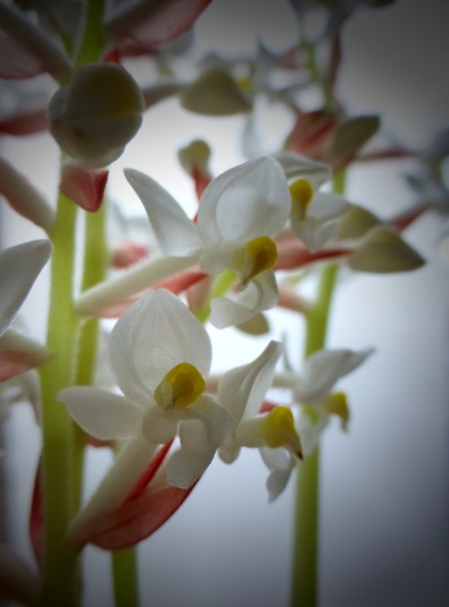 I have tucked it in a very, very sunny corner. Perhaps for that reason it forgives my neglect and on occasion produces these magnificent pale blooms on pencil thin stalks that I snip and place in an old spice jar. I’ve been photographing them against a background of white vellum.