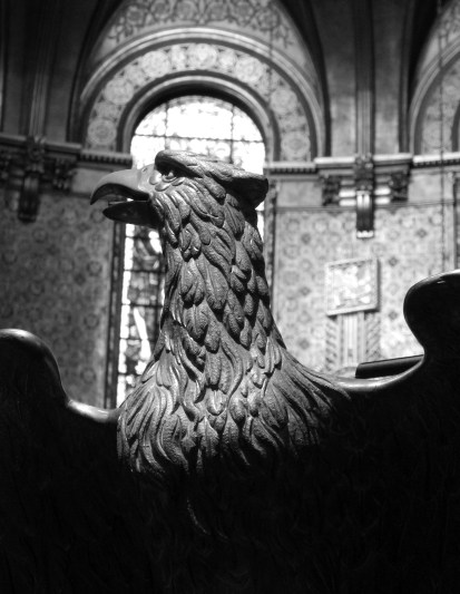 Recently I photographed the eagle lectern at Trinity Church in Copley Square, Boston. That day I had grown impatient with color and switched to black and white. And thankfully so because the play of light and shadows across the bird’s form revealed wonderful details. That lectern, original to the historic landmark (1877), was designed by Charles R. Lamb of J & R Lamb Studios of New York.