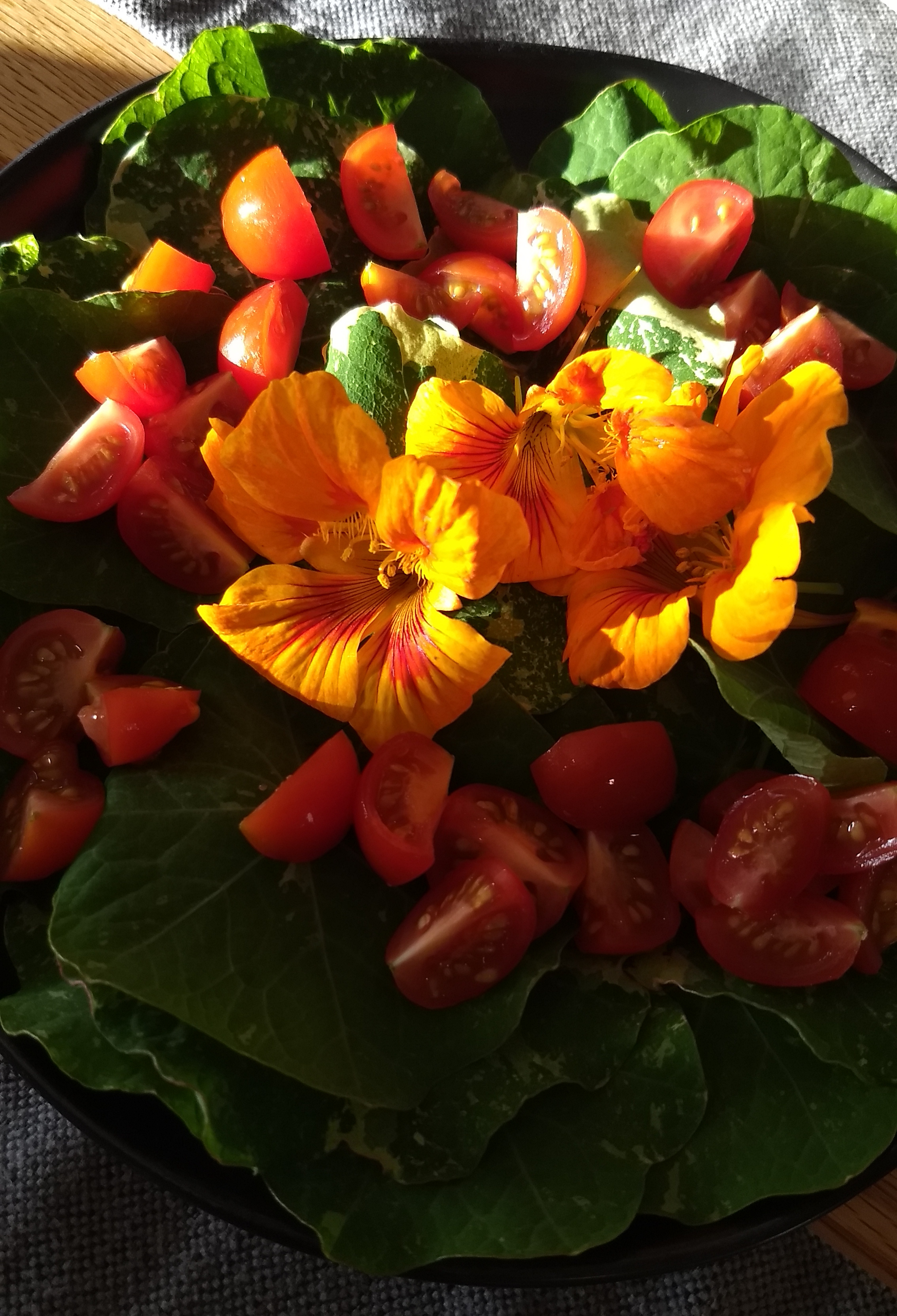 Nasturtium and borage blooms on the garden salad. Mostly for show. Like painting the green salad with dabs of bright paint.