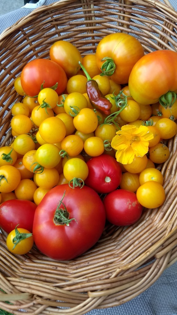 Though we near the end of a hot dry July I can look out the kitchen window into the garden below and I can see tomatoes reddening. Roma and Big Boy (or Girl) and a cherry variety. A lot of things are withering in the current heat wave. Sunday will be 100. There’s a part of me, and I did confer with that fellow, that knows some things have had their run and so in the cool of the morning I will simply need to weed and clean and begin to prep the earth for our fall plantings. I must say I never imagined that indoor and outside watering could be an exercise. But I think it truly is!