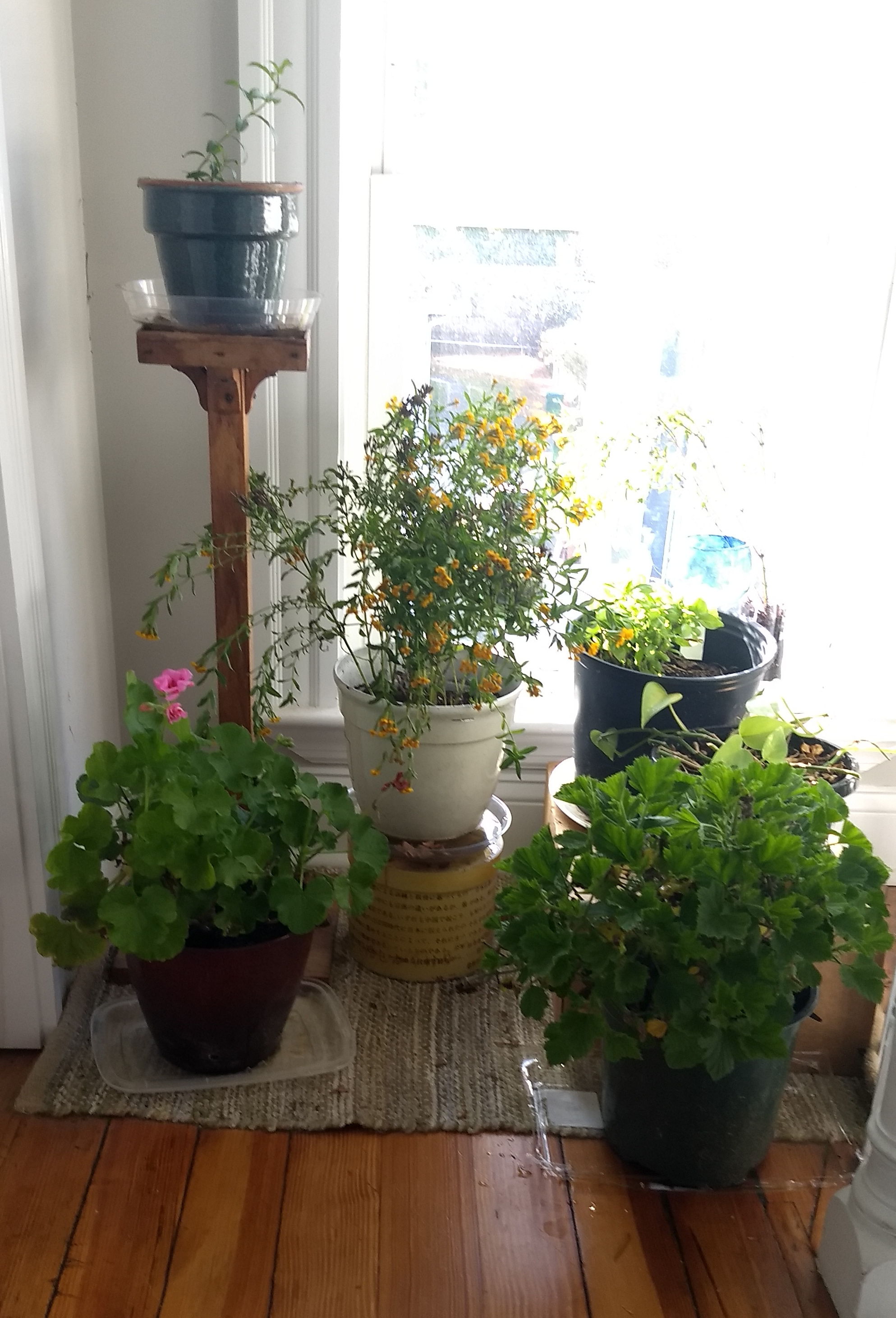 This area was once filled with pothos that had way overgrown and once upon a time was lush and green but after much unattendance this summer had become gnarly and brown so … I cleaned house so to speak. Many a pothos tendril is sitting in jars of water waiting to root so this area may be pothos-strewn once more but for now light falls upon summer garden herbs and flowers that will hopefully find this to overwinter.