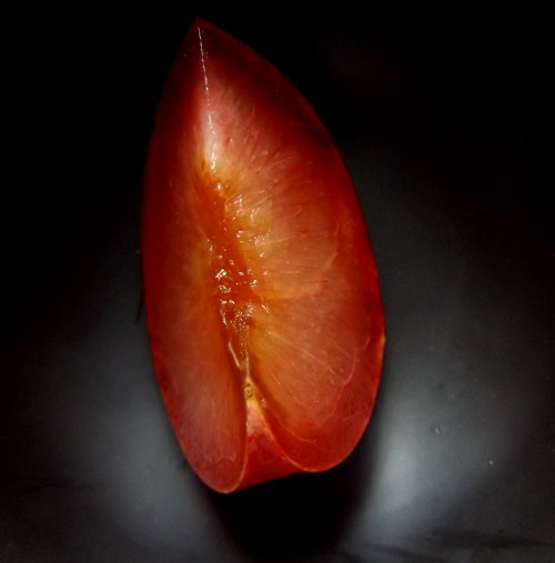 The fruit was purchased at a roadside stand, warm red exterior and bright gold interior. Sweet and tangy. A delightful treat. And now I have this seed. To plant or not to plant? 😉