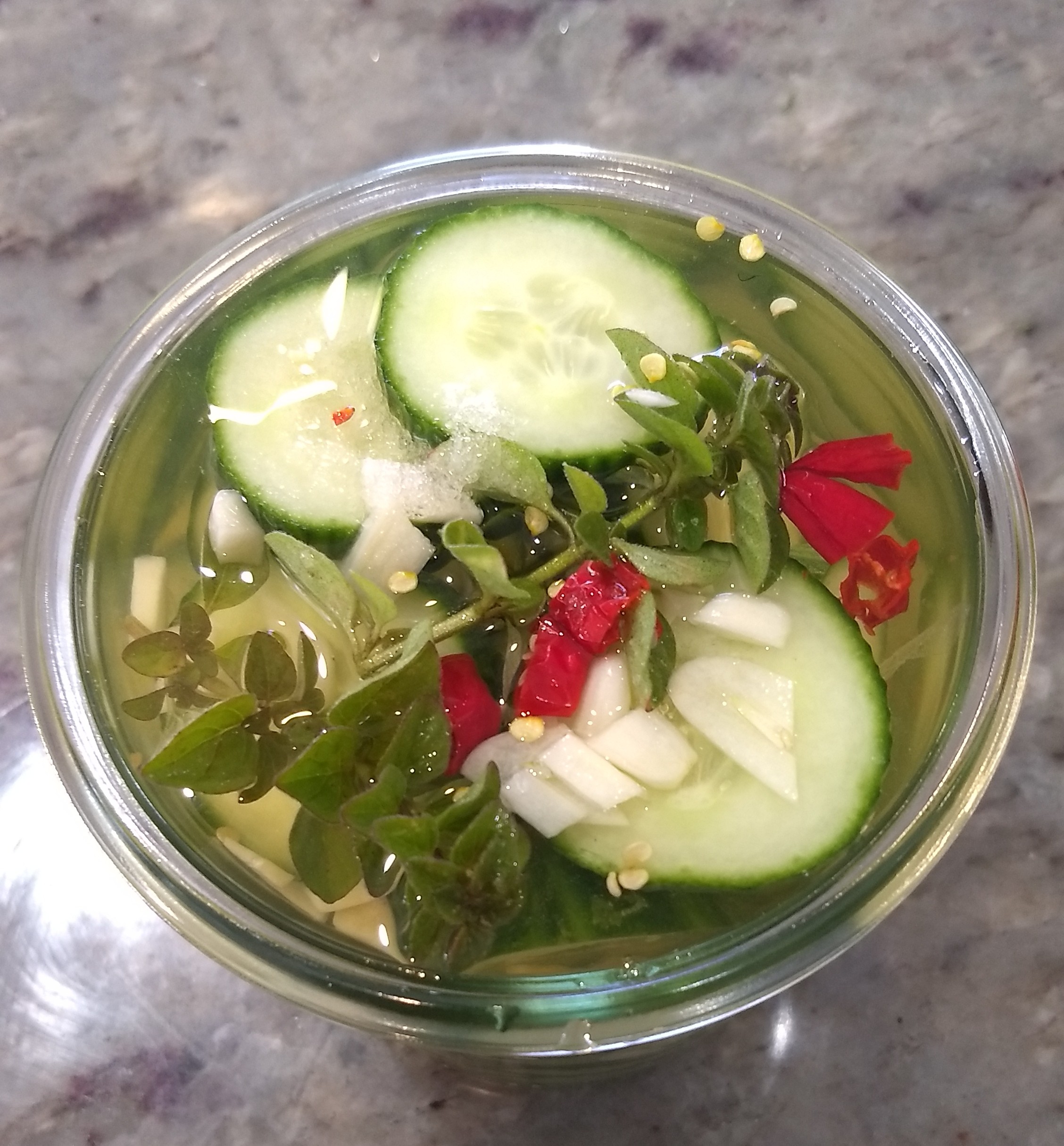 Working with what’s available in the house … cucumbers, white wine vinegar, light brown sugar, kosher salt, garlic, red peppers and oregano. We’ll see how this batch turns out.
