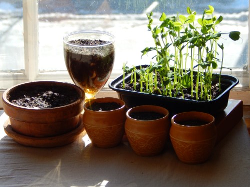 in a recycled carry out container grows pea sprouts that are quite tasty with tomatoes and hummus. In the gold goblet, upland cress is hopefully germinating. Their sprouts from a previous harvest were quite fine on smoked salmon. And I think in the clay pots I planted some combination of sunflowers and a spicy mesclun mix. The sun shines on them bright so we’ll see what happens next. And, meanwhile, outside and down below, that same sun shines intense on a landscape covered in ice and snow.