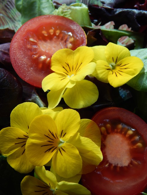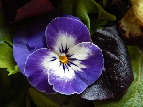 violas dotting the salad greens
