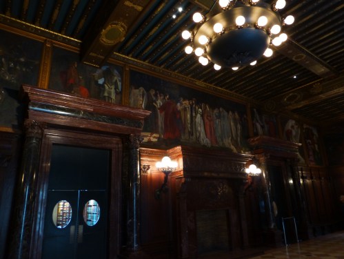 The Abbey Room is located on the second floor of the McKim Building in the Boston Public Library in Copley Square.  Its high walls are covered by a series of mural paintings depicting The Quest for the Holy Grail.  A lovely place to hang out on a rainy day in Boston.