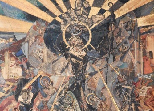 Each section of the painting, and of the final mural, has meaning. The image is divided into seven parts, depicting seven scenes from Dominic’s life, from the center upper part where “God’s Hand puts halo around St. Dominic and drops into beggar’s bowl a star …” to the center lower part where “Two Angels lift the saintly pilgrim by his bleeding feet toward the stars in heaven.