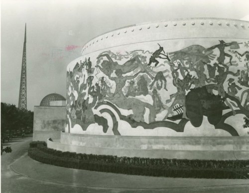 For the 1939-1940 New York World’s Fair, he created murals for Food Building North No. 2.  As described by a journalist covering the fair for Collier’s Magazine in 1939, There was Pierre Bourdelle, stripped to the waist in the hot sun and covered with red plaster dust. Gobs of wet plaster, a good blank wall, tools in his hands. That’s all Bourdelle, pupil of Rodin, asks to make him happy.”