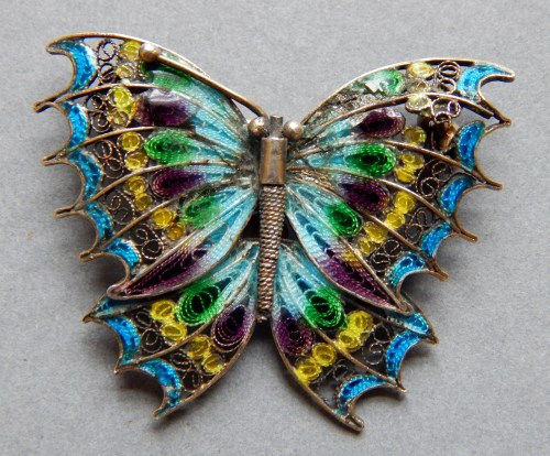 That’s the translation of the little slip of paper on the back of the butterfly, Plique a jour. An enameling technique similar to cloisonne but with no backing so that the light can shine through. It’s meant to be worn as a pin but I might turn it into an occasional suncatcher. A wonderful find in an old shop. A dainty little thing, bits of damage, an antennae missing. Still beautiful. And as much as the design, I like that idea of letting in daylight at any time of day.