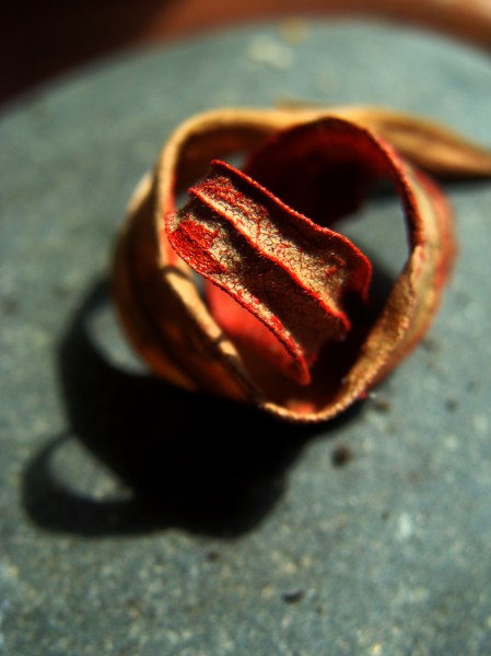 A leaf found in a field on the way home. I let it sit in the window a few days to dry. I still have it, tucked safely away, so we’ll see how it continues to evolve.