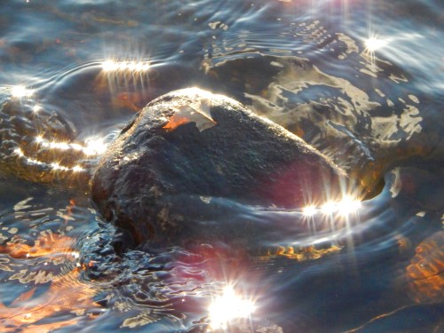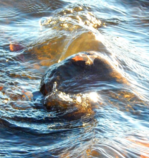 Waters lapped upon the shore, cascaded over the rocks and swirled small broken branches about. A lovely sight especially when I realized in the water the blinding light was subdued. It was a delight.