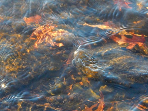 Autumn leaves floating on the water’s surface first caught my attention, but the brightest of the leaves lay on the bottom. I’m not sure what forces kept them there even as the fountain’s mechanics and nature’s wind erratically churned the water. The sun was bright too, low angled. It dispersed in the waters producing rainbows.