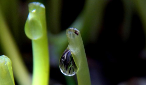 One of the wonders of an indoor garden for me is the opportunity to look back. I can snip my sprouts, in this case sunflowers, and then after tossing them onto a plate, I can look back at their pot and I find such glorious things like liquid rolling down a stem.
