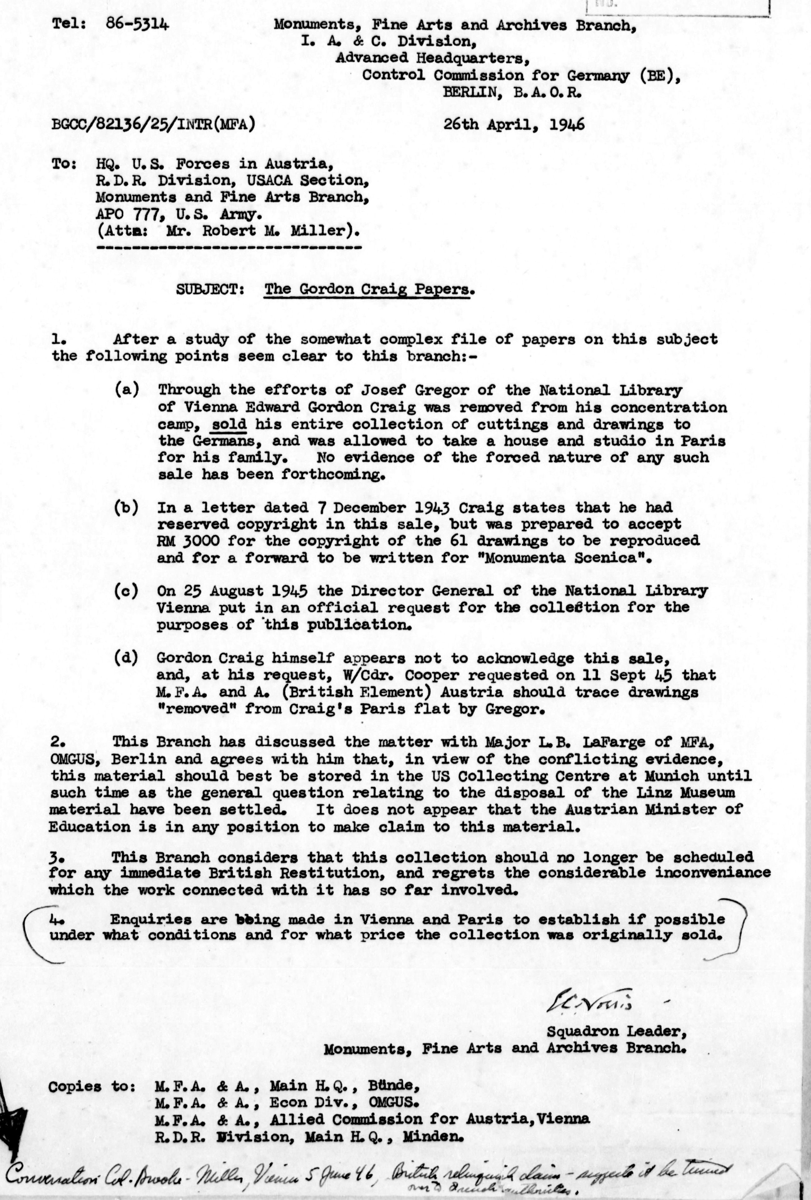 By 1947, relations with the Russians had deteriorated significantly, adversely affecting the restitution of items to individuals and institutions in Russian-controlled territories, and the exchange of items between the Russian Zone and other Allied Zones. With plans well underway to revitalize German economy and culture (including denazification), military and intelligence priorities shifted to stopping the Russians. And so Horne like many within the MFA&A unit followed orders as high level officials made clear that those in the U.S. intelligence sector had full access to depot materials and freedom to act as they deemed necessary.