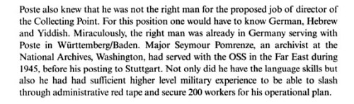 In his book, The Safekeepers: Memoir of the Arts at the End of World War II (2000), Walter Ings Farmer writes that “The story of the Offenbach Archival Depot has never received the attention given to restoration of monuments … Nevertheless an account of MFA&A activities in the Frankfurt area would be incomplete without a description of the rescue of the literary and scriptural treasures that the Nazis had looted with the same nefarious purposes they applied to art collections. … Looting of libraries became as integral to the Nazis plan for cultural domination as the looting of art collections.”