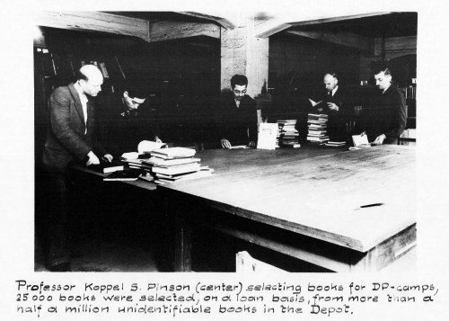 In late 1945, when the YIVO library was identified as being in Frankfurt, visiting Jewish scholar, Prof. Koppel S. Pinson sought permission from the YIVO leadership in New York to distribute, like a lending library, some of the unidentifiable books to Jews living in the Displacement Camps. It would take time but he would be granted such authority.