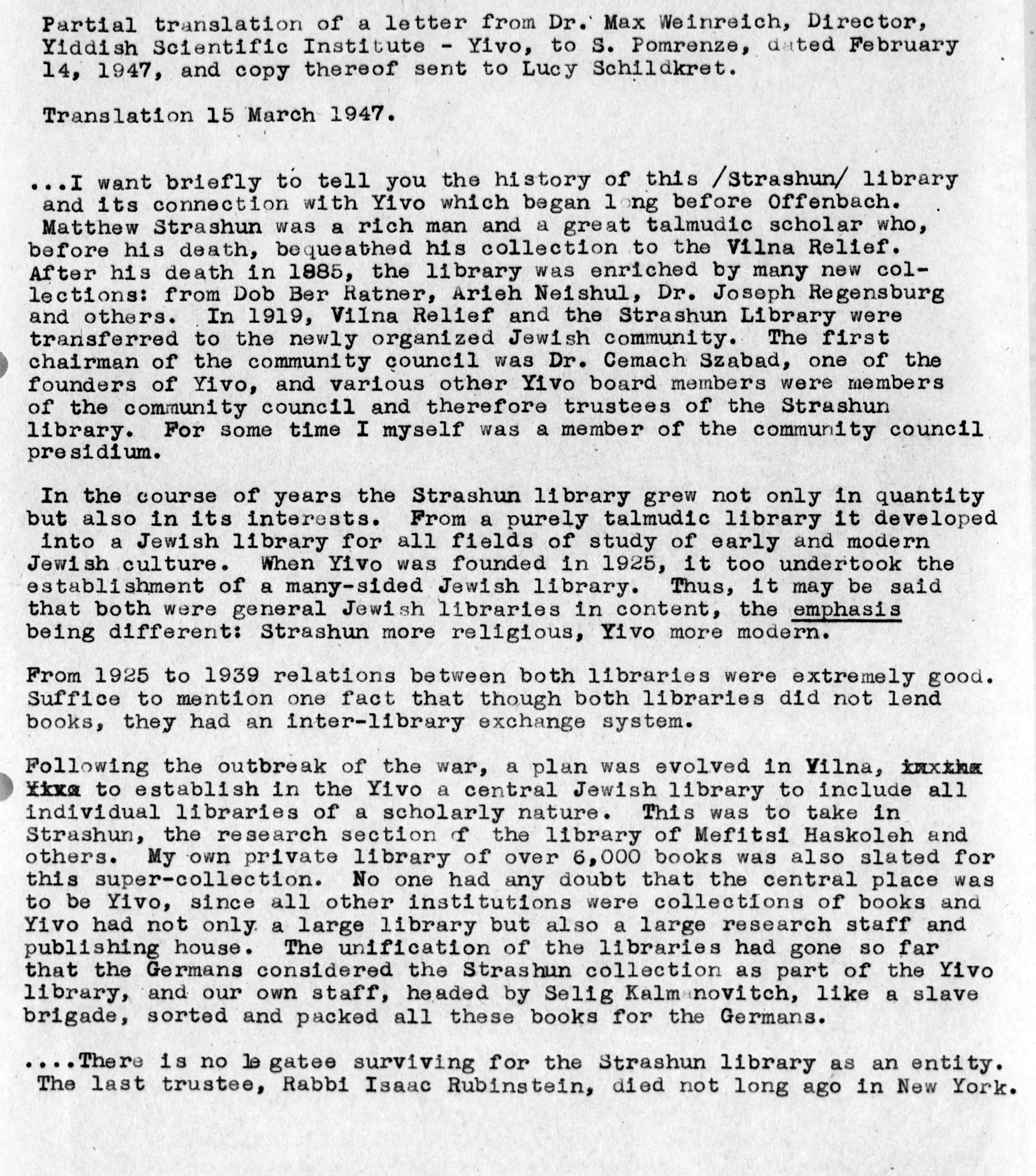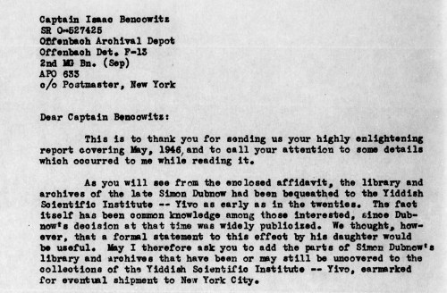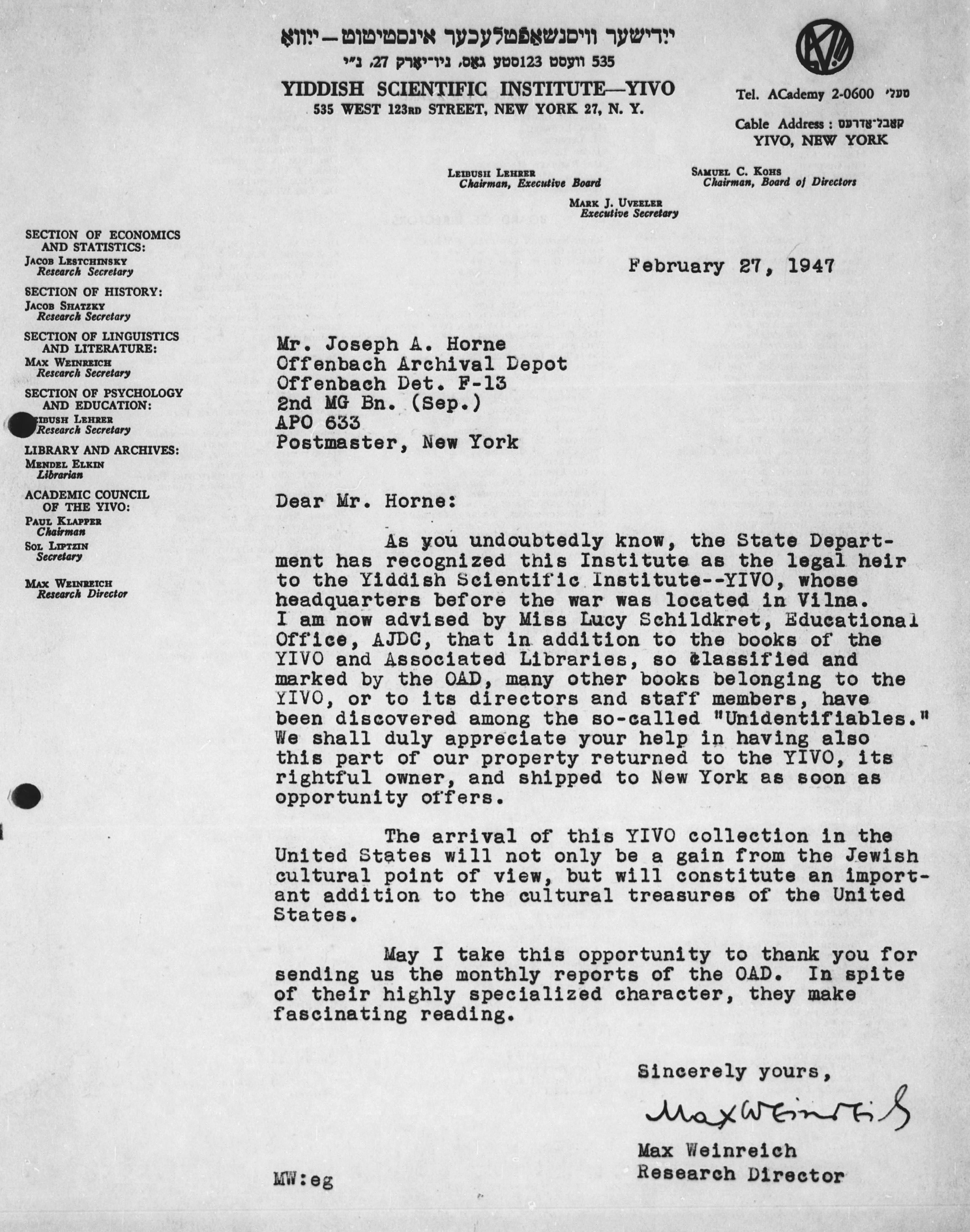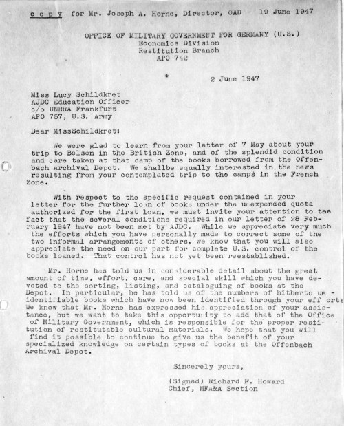 Though correspondence about the YIVO library begins in 1945, by early 1947 the vast library had yet to be shipped to YIVO in New York. The reasons include continual reduction in manpower, both skilled and unskilled, at the depot and complex, bureaucratic chains of command within the U.S. military, between the Allied zones and even within the YIVO organization. In a March 1947 document, Horne reports to his superiors that Miss Schildkret has been unable to examine several hundred thousand unidentified books because she had yet to receive authorization.