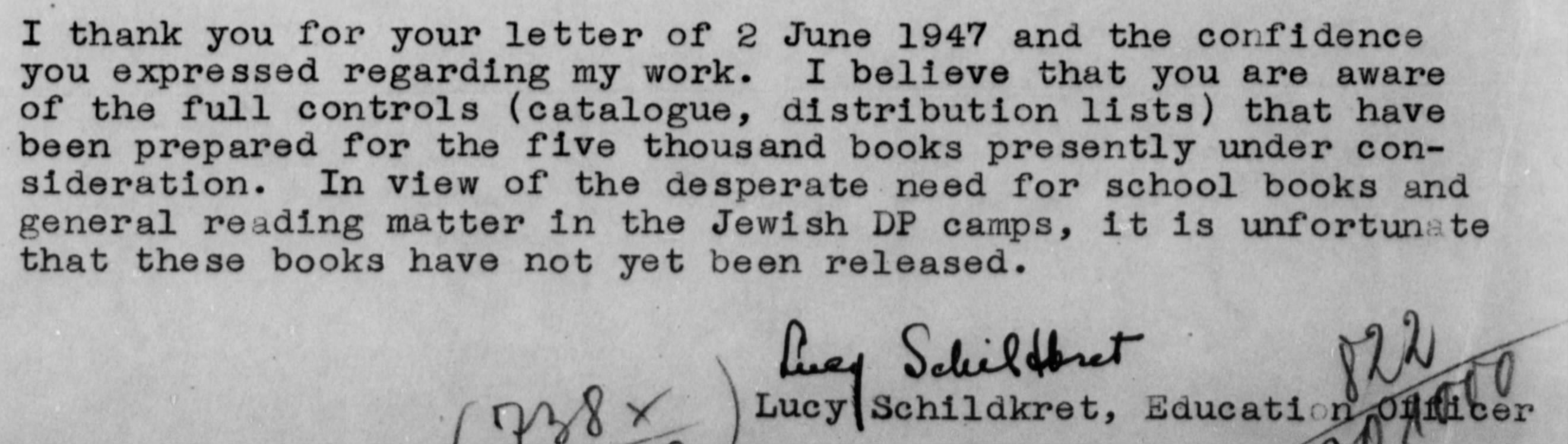 In 1938, Lucy Schildkret had studied in Vilna and worked at the YIVO. Prior to the war, she would return to the U.S. and work as assistant to the research director at the YIVO headquarters in New York. In 1946 she journeyed to Europe as an educational worker with the American Jewish Joint Distribution Committee (AJDC), the largest Jewish relief organization in America. Through this organization she was able to work with displaced persons in the camps. With her skills in Yiddish and time at YIVO, she was able to discern that books that had been labeled as unidentifiable were indeed identifiable. But even as she acquired the authority to help identify the YIVO library, she maintained her focus of serving the people housed in the displacement camps, and she would do so with a tenacity that would characterize her career for decades to come.