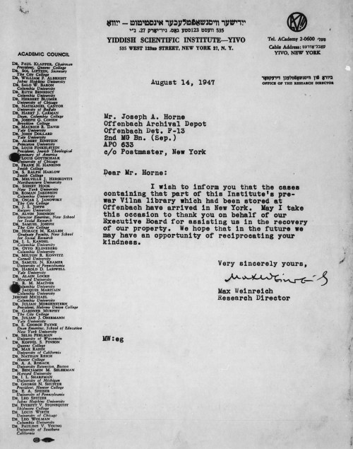 In her memoir, From That Place and Time, Lucy Schildkret describes her encounter with Horne as she works to sort, identify and return the YIVO library of Vilna, Poland. The Yiddish Scientific Institute (YIVO) was founded in 1925 for the scientific study of Jewish life. Headquartered in Vilna, the institute had branches around the world including the United States. At the start of the war its headquarters were transferred to New York City.