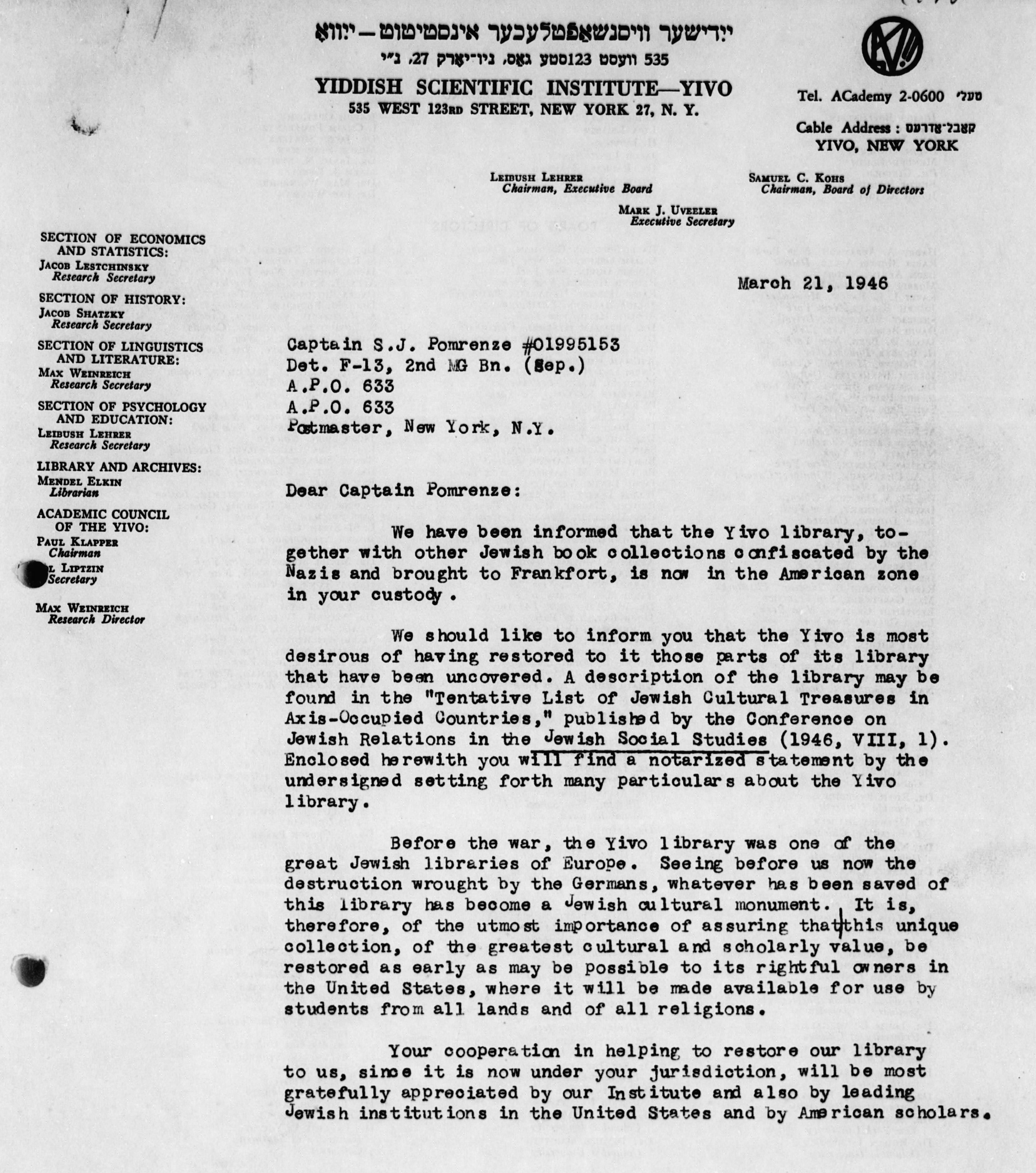 The complexities of sorting, identifying and returning books at the scale demanded of the Offenbach Archival Depot become clearer when reading through the declassified documents relating to what happened with just the YIVO library. For instance, YIVO like many libraries of its size and mission had been the repository of family libraries. Books at Offenbach were being identified by ex-libris and other markings as belonging to individuals and/or their families but they had in fact been donated to YIVO (or other institutions) by family members. There are numerous letters between YIVO administrators with U.S. military officials trying to prove the ownership of items.