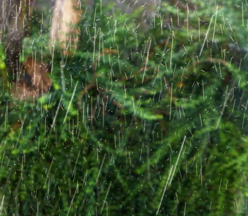 The fluff of the cottonwood tree filled the air like snow and coated the surface of the pond. Plus there was the pollen, pond algae and the dust stirred up by the adjacent construction project.