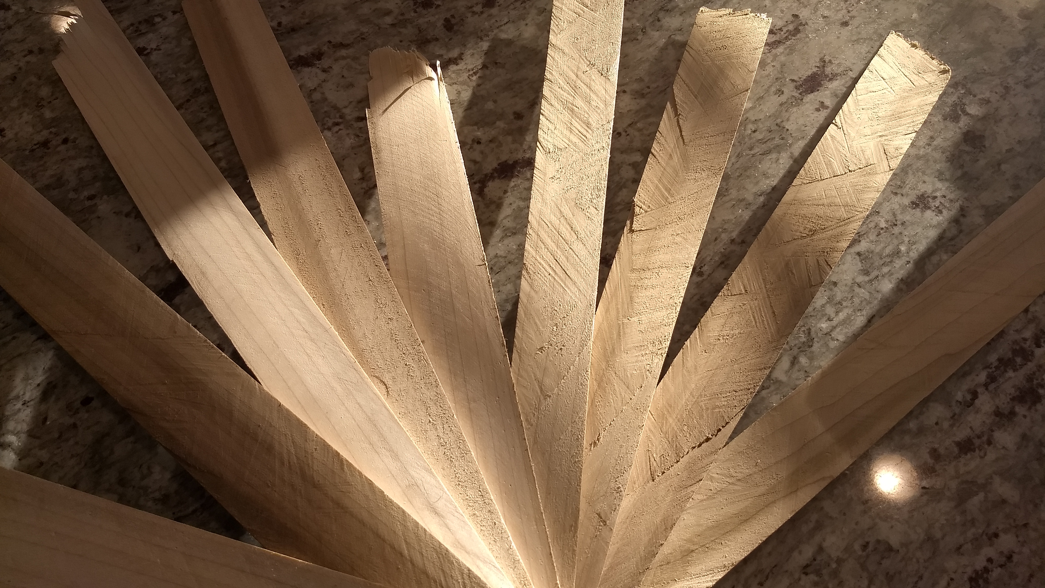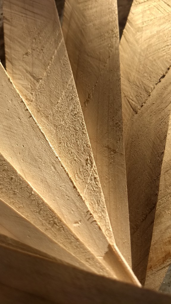 When Steve tapered the legs of the dining room table he made by hand this pandemic season … I gardened, he made furniture … these pieces of wood were left behind. Now he told me about these pieces before I actually saw them and said, “I can turn them into a fan for you to do something with. I just need to get the right bolt.” “You mean like a Japanese fan?” He shrugged. “Yeah, more or less.” And I exclaimed with glee, “Yes, make that and we’ll hang it on the wall.”