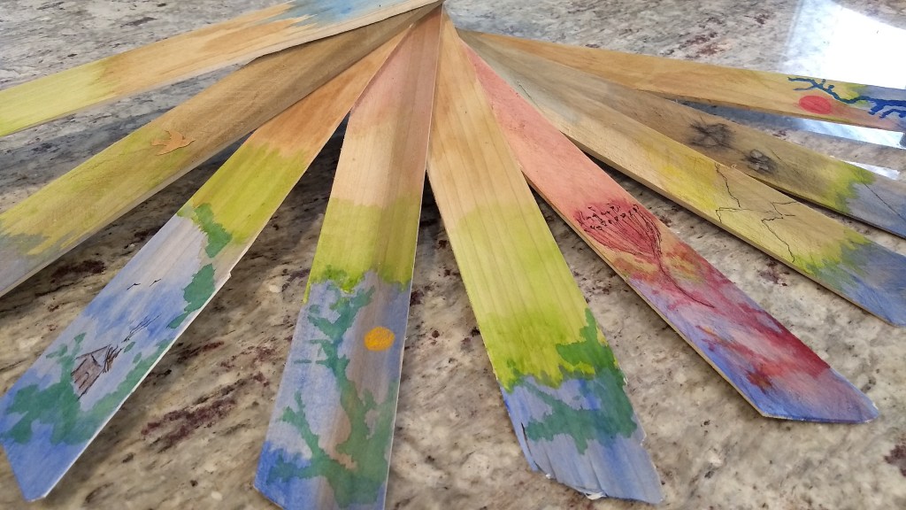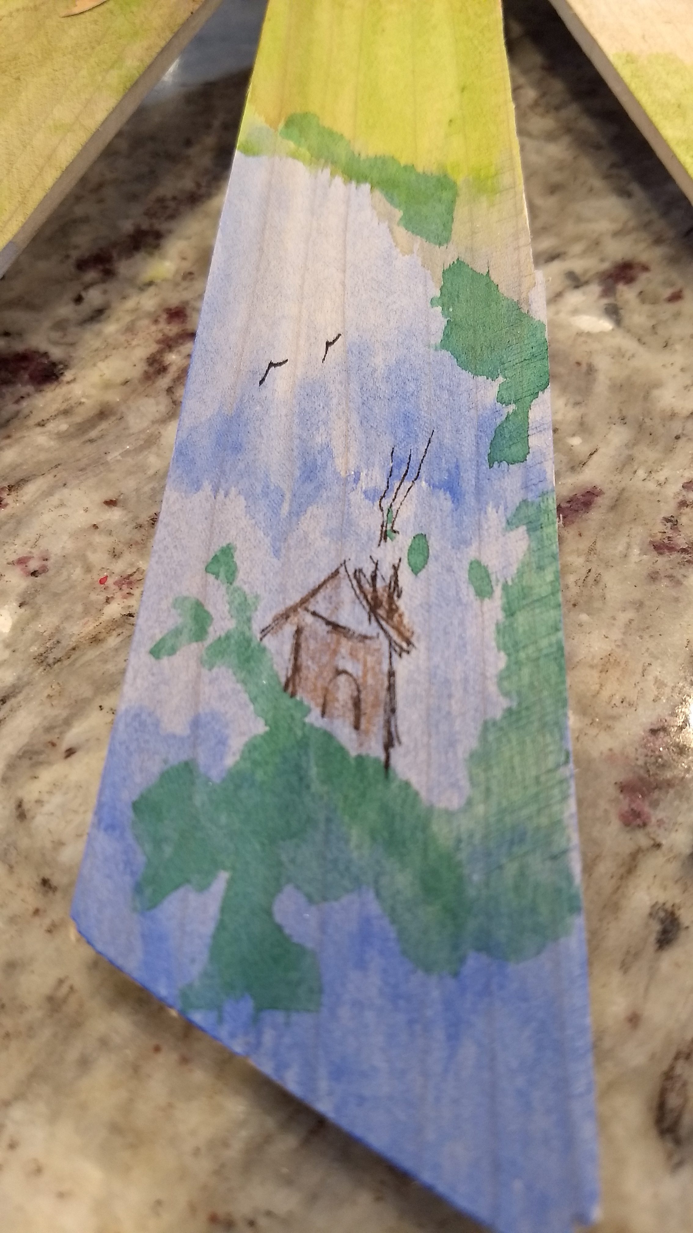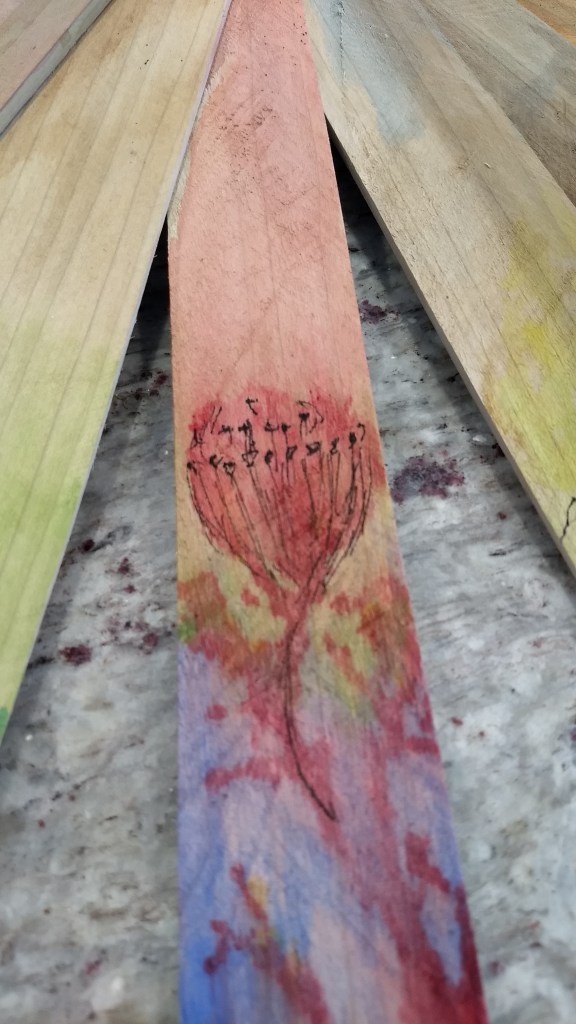 Watercolor on wood. You can’t get much more ephemeral so who knows I may use these same thin pieces again one day. But this fan can stay as it is for a bit because a certain someone is beginning to work on a new table. A much smaller table. We’ll see what falls by the wayside this time for our next collaboration. Be well,everyone. 🙂